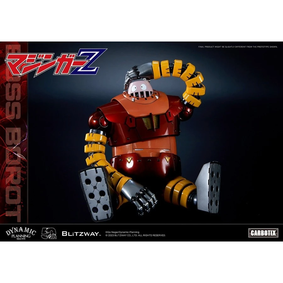 Boss Borot tratto da Mazinga Z entra nella line-up Blitzway Blitzway Carbotix Hybrid Carbon Action Figure Series, azione completa alto 20.5cm. Realizzato in ABS, PVC, POM, metallo die-cast e presenta un sistema di illuminazione LED nella testa. Viene fornito con 4 volti intercambiabili, 6 mani intercambiabili, missili, fionda, cesto, maschera da sub, pinne da sub e 3 mini figure di Boss, Nuke e Mucha.