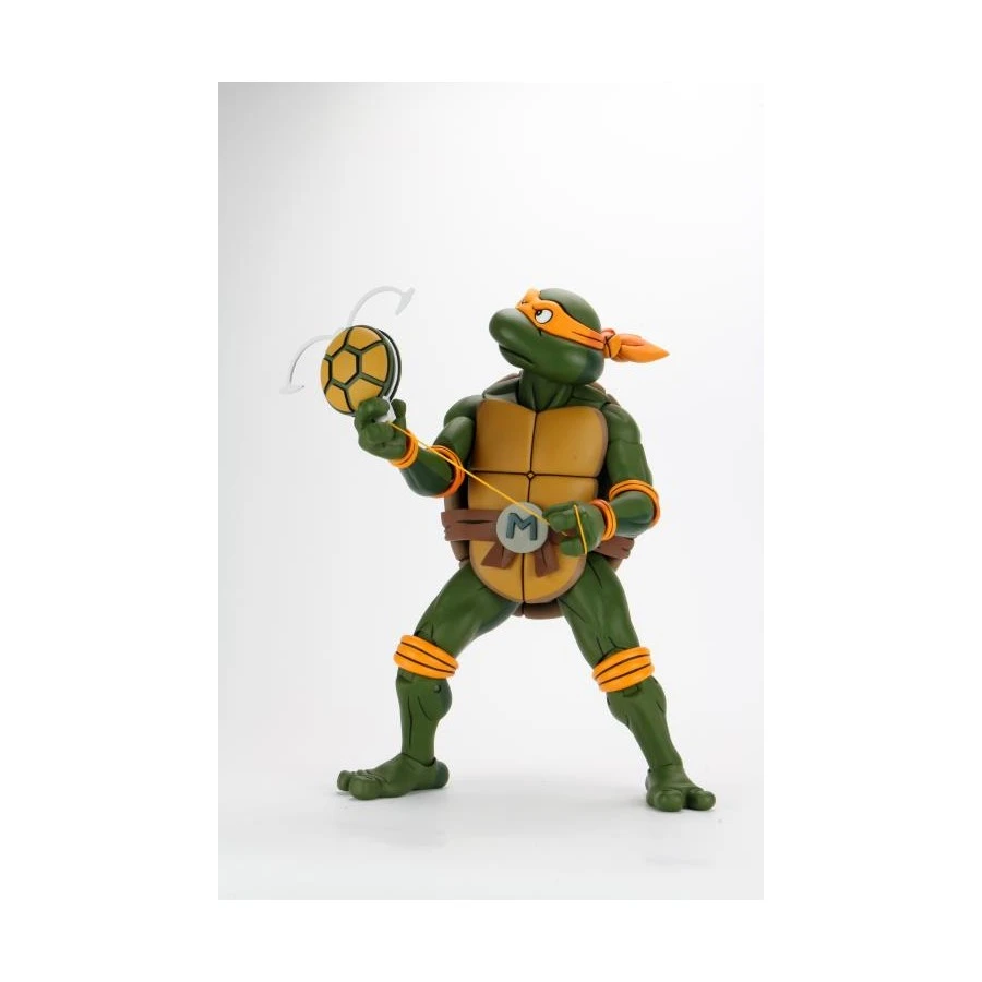 Michelangelo tratto da Tartarughe Ninj Alla Riscossa entra nella line-up Neca Giant Size, azione completa alto 38cm. Viene fornito con 1 testa intercambiabile, 6 mani intercambiabili, 2 nuchaku, radiotrasmettitore, rampino e 2 fette di pizza